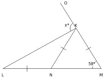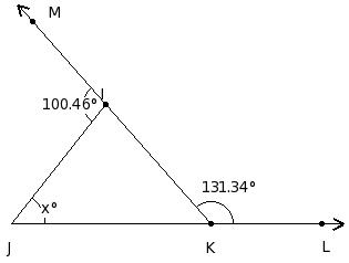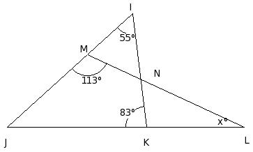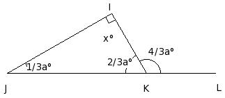 In the given figure, △IJK in which side JK has been produced to L. If ∠KIJ = x° , ∠IJK = (1/3a)° , ∠JKI = (2/3a)° and ∠IKL = (4/3a)°, find the values of a and x.