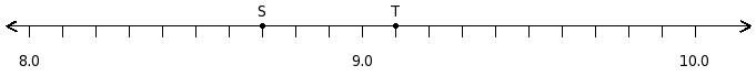 Find the difference of the decimal numbers at the points labelled with letters S and T