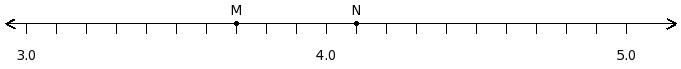 Find the difference of the decimal numbers at the points labelled with letters M and N