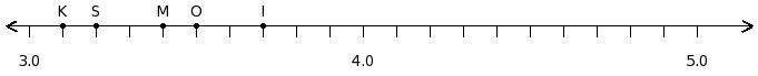 Find the decimal number at the point labelled with letter I