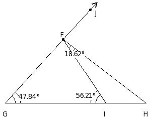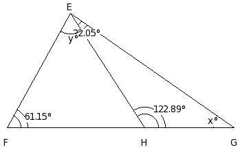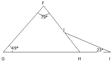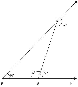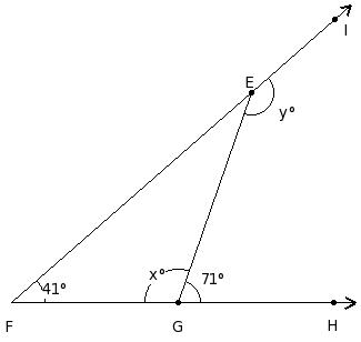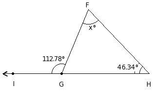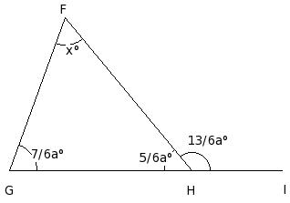 In the given figure, △FGH in which side GH has been produced to I. If ∠HFG = x° , ∠FGH = (7/6a)° , ∠GHF = (5/6a)° and ∠FHI = (13/6a)°, find the values of a and x.