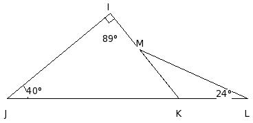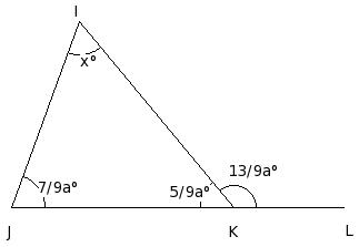 In the given figure, △IJK in which side JK has been produced to L. If ∠KIJ = x° , ∠IJK = (7/9a)° , ∠JKI = (5/9a)° and ∠IKL = (13/9a)°, find the values of a and x.