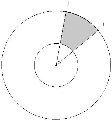 In the given figure, arcs of two concentric circles of radii 18.00 cm and 7.20 cm are drawn with center O. If ∠IOJ = 40°, find the area of the shaded region