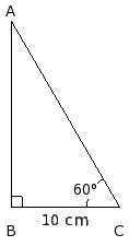 In the given figure, △ABC is right angled at B. If BC = 10 cm and ∠C = 60°, find AB and AC
