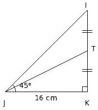 In the given figure, △IJK is a right angle triangle with ∠K = 90° and JK = 16 cm. T is the mid-point of IK. Find TK