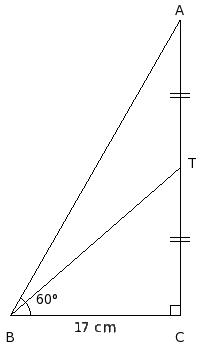 In the given figure, △ABC is a right angle triangle with ∠C = 90° and BC = 17 cm. T is the mid-point of AC. Find TC