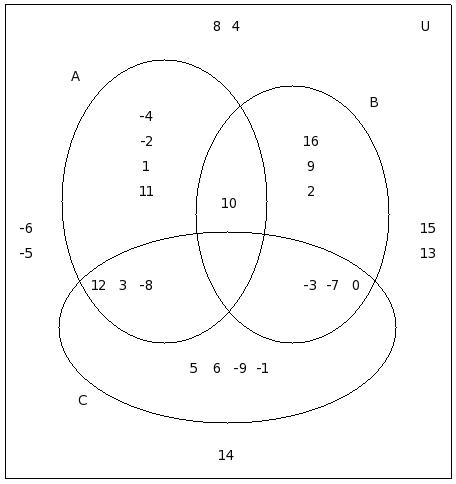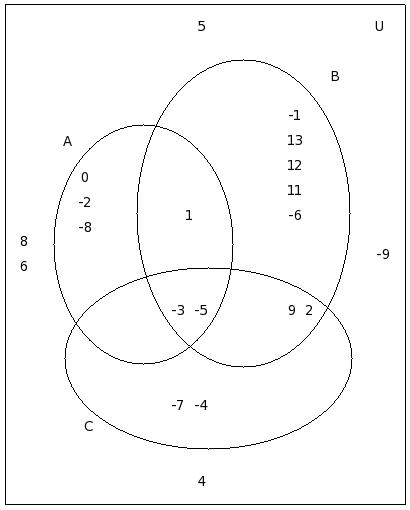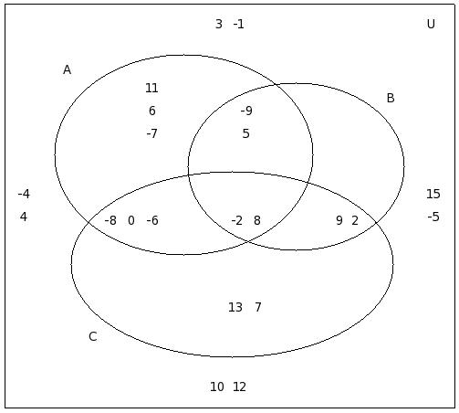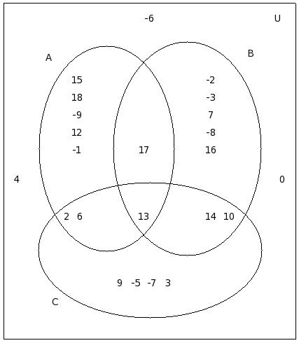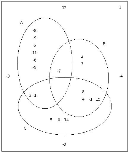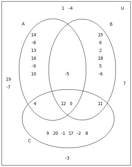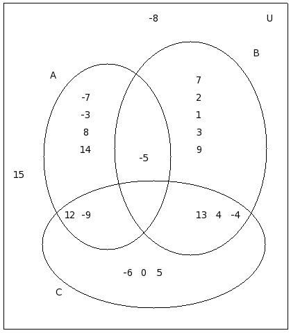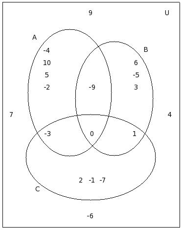 If μ = {2,7,-7,6,5,-1,-4,-2,-8,3,4,12,10,-5,9,-9,11,-3,-6},A = {2,7,-7,6,5,-1}, B = {-4,-2,-8,3,7,4,12,5,10}, C = {-5,9,-9,6,3,7}, find (C − A) ∪ (C − B)