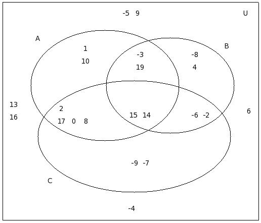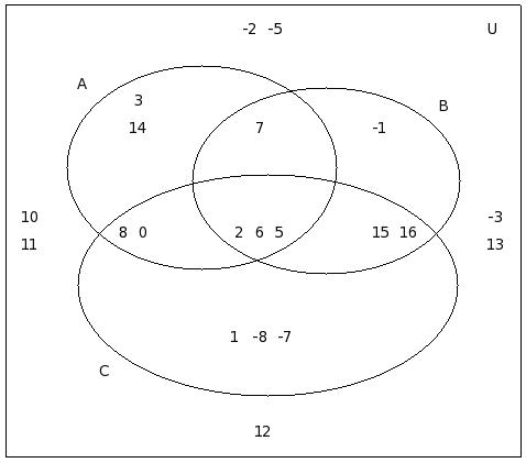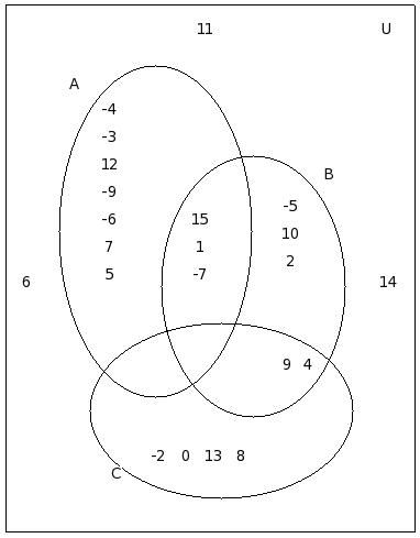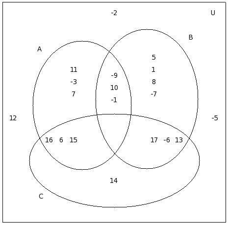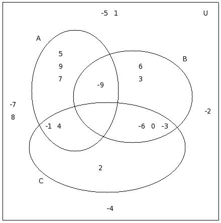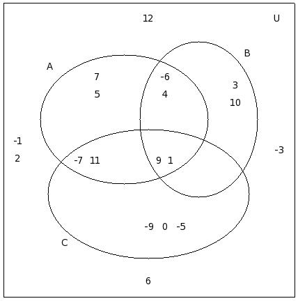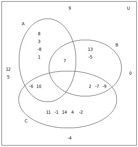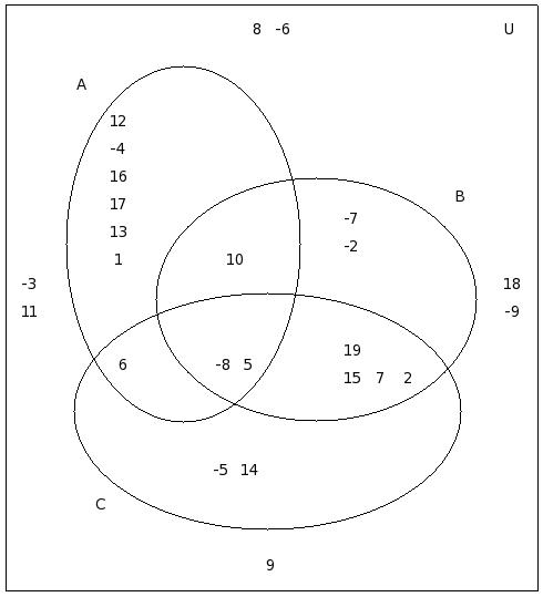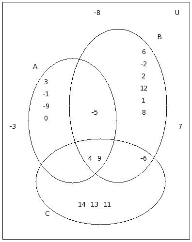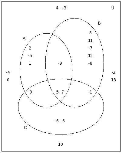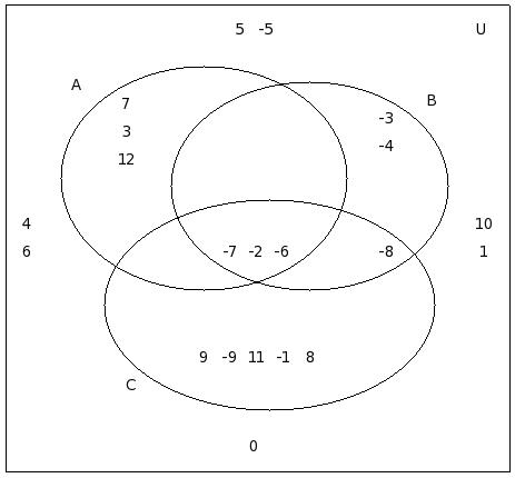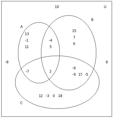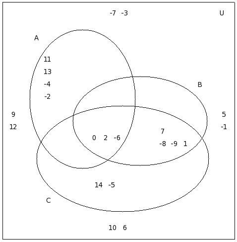 If μ = {12,-8,6,2,9,-4,5,7,-7,10,11,0,-2,-9,8,13,1,-5,-3},A = {12,-8,6,2,9,-4}, B = {-8,6,5,-4,7,9,-7,10}, C = {11,7,0,2,-4,-2,-9,9}, find (C − A) ∪ (C − B)