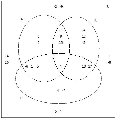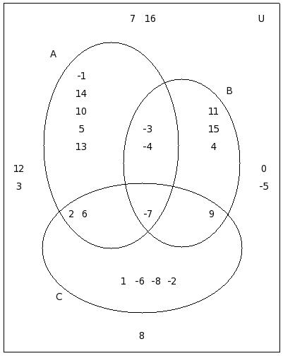 If μ = {-9,15,-1,1,0,16,13,5,-7,-2,-8,10,6,7,-4,8,12,-6,2,14},A = {-9,15,-1,1,0,16,13,5}, B = {-7,0,-2,1,-9,-8,10}, C = {6,10,7,1,-8,-4,5,8,15,12}, find (C − A) ∩ (C − B)