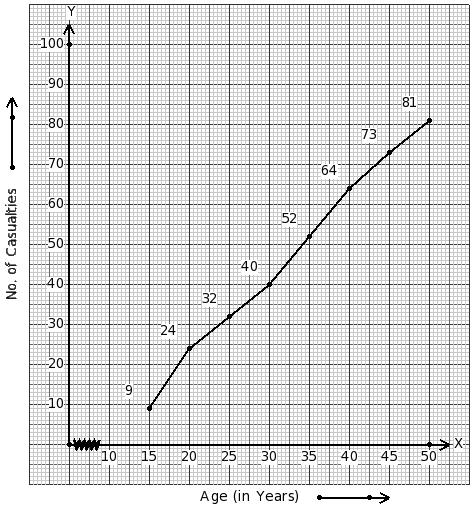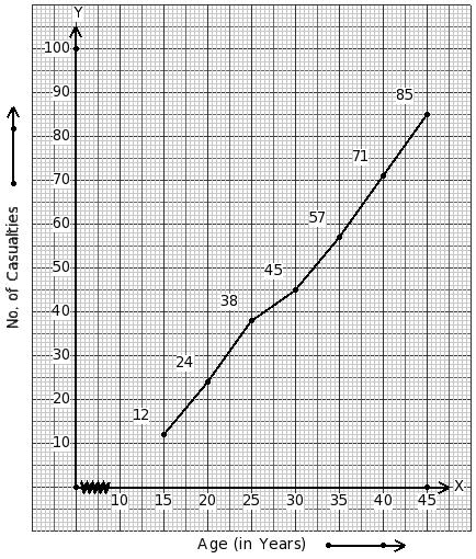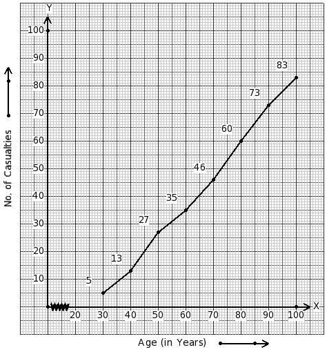 The following ogive shows the number of casualties of different age groups due to accidents in a city. Estimate the median.