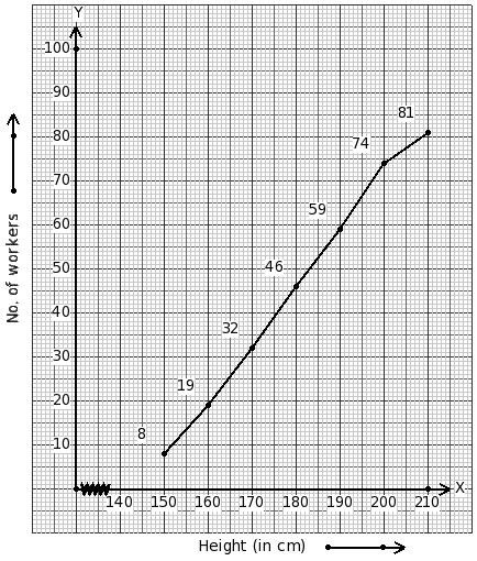 The following ogive shows the distribution of the heights of a group of factory workers. Estimate the median.