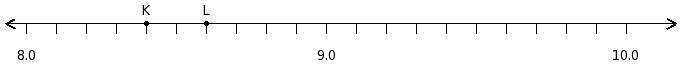 Find the difference of the decimal numbers at the points labelled with letters K and L