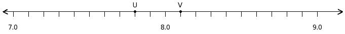 Find the sum of the decimal numbers at the points labelled with letters U and V