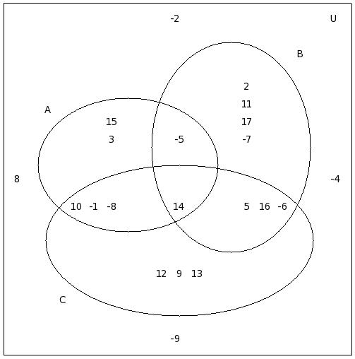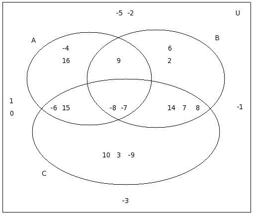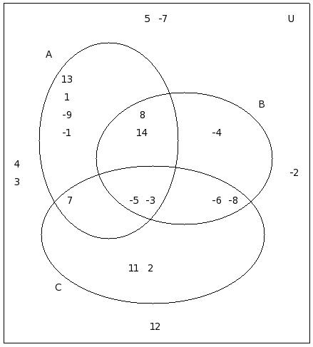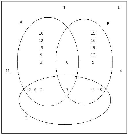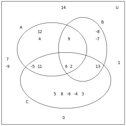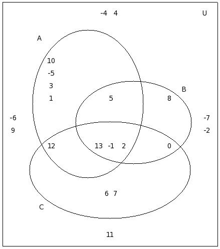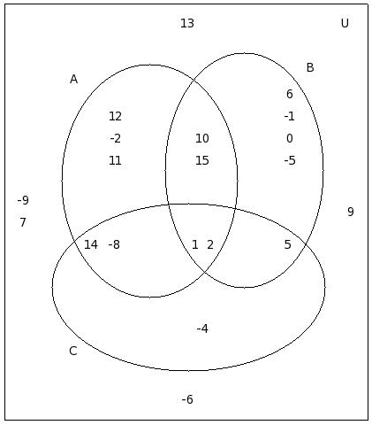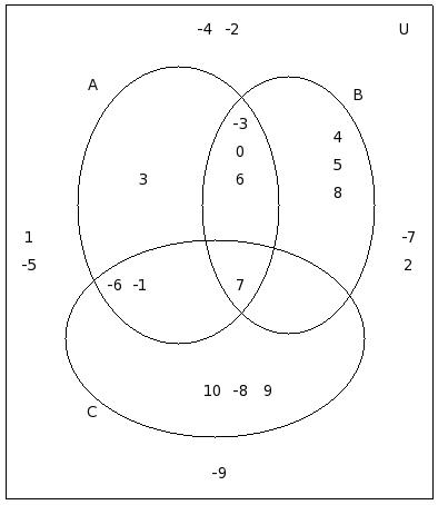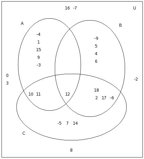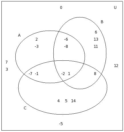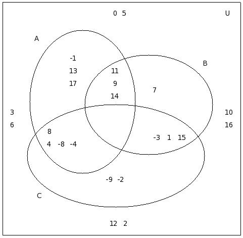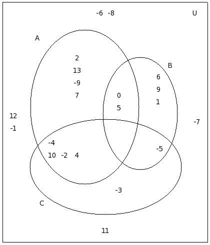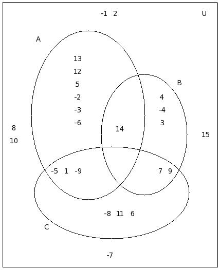 If μ = {0,5,15,1,-4,-8,7,-9,13,-7,8,-1,-6,6,11,19,14,10,4,16,-2,3,2},A = {0,5,15,1,-4,-8,7,-9,13}, B = {-7,8,-1,-6,0,6,11,19,14}, C = {11,19,10,0,1,-4,-9,-7,4,13}, find (A ∩ B)' |