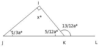 In the given figure, △IJK in which side JK has been produced to L. If ∠KIJ = x° , ∠IJK = (1/3a)° , ∠JKI = (5/12a)° and ∠IKL = (13/12a)°, find the values of a and x.
