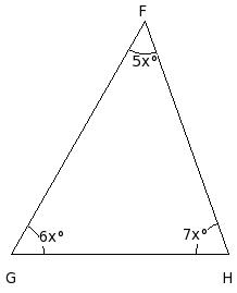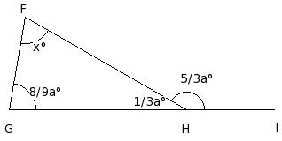 In the given figure, △FGH in which side GH has been produced to I. If ∠HFG = x° , ∠FGH = (8/9a)° , ∠GHF = (1/3a)° and ∠FHI = (5/3a)°, find the values of a and x.