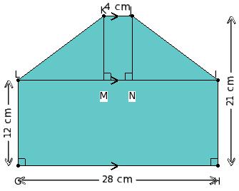 Find the area of the shaded region of the adjoining figure, given that ∠LGH = ∠IHG = 90°, KJ ∥ GH ∥ LI, KM ⟂ LI, JN ⟂ LI, LM = NI, GH = 28 cm, GL = 12 cm, KJ = 4 cm and distance between GH and KJ is 21 cm