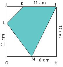 Find the area of the shaded region in the adjoining figure, given that GHIJ is a square of side 17 cm, IK = 11 cm, LG = 11 cm and HM = 8 cm