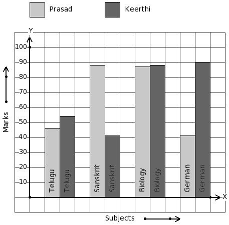 Marks obtained by two students Prasad and Keerthi in diferent subjects are shown in the bar graph. Identify the table for the given bar diagram.