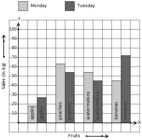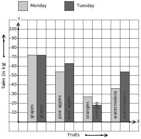 This graph gives a comparative account of sales (in Rs) of various fruits over a two-day period. Identify the table for the given bar diagram.