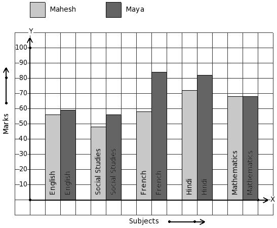 Marks obtained by two students Mahesh and Maya in diferent subjects are shown in the bar graph. Identify the table for the given bar diagram.