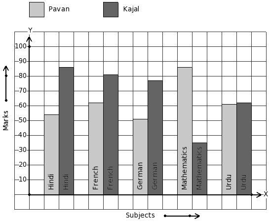 Marks obtained by two students Pavan and Kajal in diferent subjects are shown in the bar graph. Identify the table for the given bar diagram.