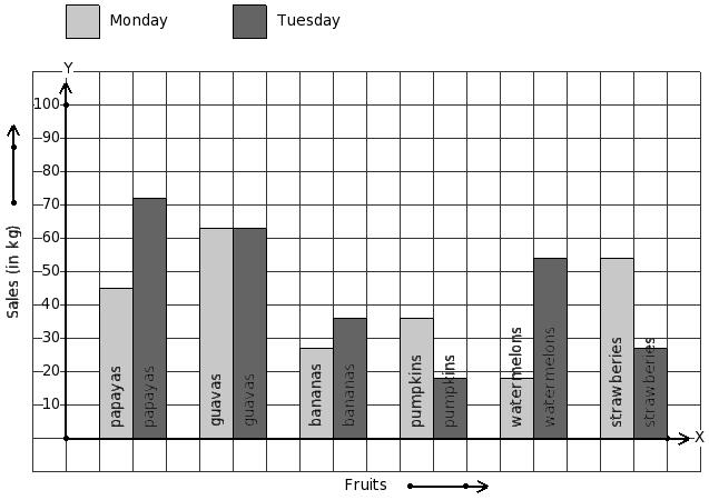 This graph gives a comparative account of sales (in Rs) of various fruits over a two-day period. Identify the table for the given bar diagram.