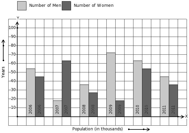 Population (in thousands) of men and women in a village in different years. Identify the table for the given line graph.