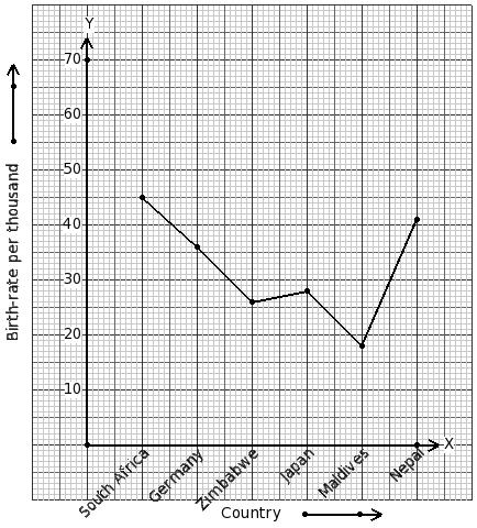 The birth-rate per thousand of 6 countries over a period of time is shown below. Identify the table for the given line graph.