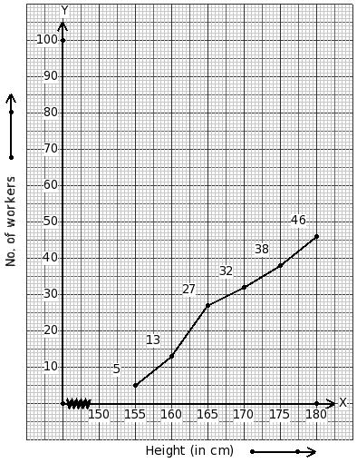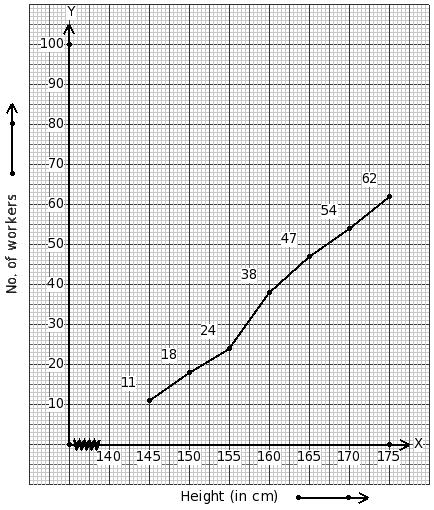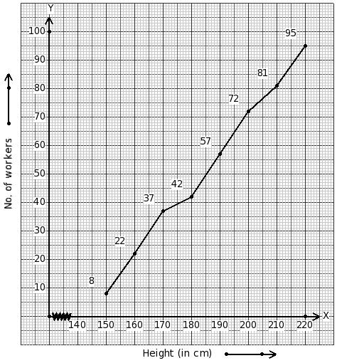 The following ogive shows the distribution of the heights of a group of factory workers. Estimate the median.