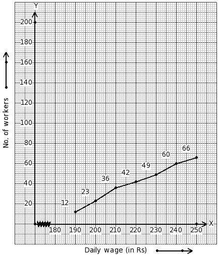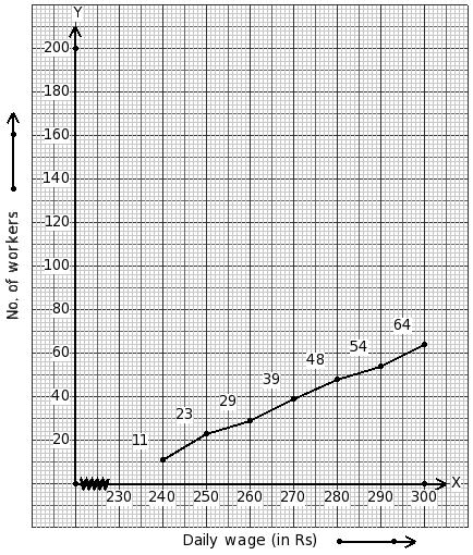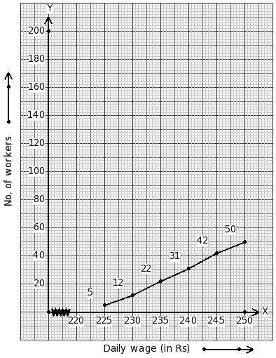 The following ogive shows the daily wages of workers in a factory. Estimate the median.