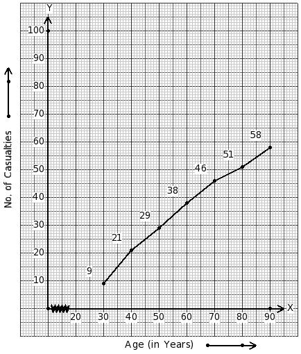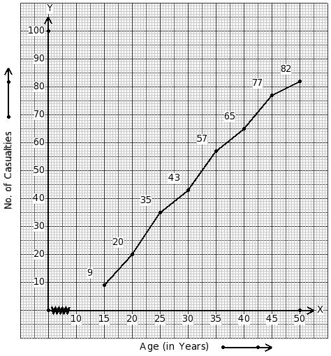 The following ogive shows the number of casualties of different age groups due to accidents in a city. Estimate the median.