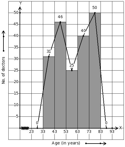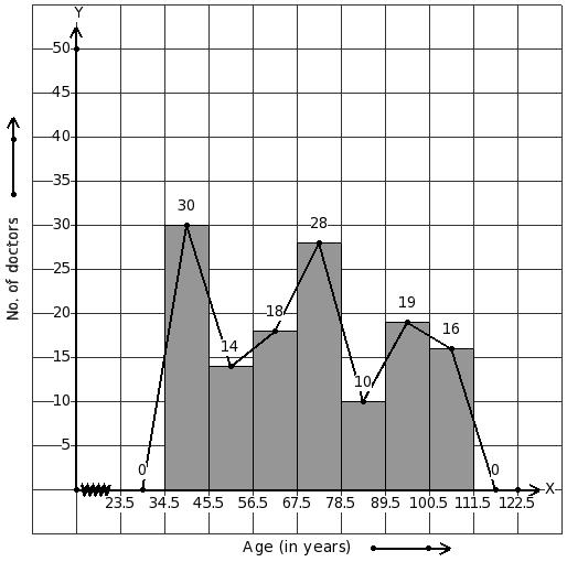 Given the number of doctors working in government hospitals in a city in various age groups. Identify the class interval table for the given histogram and frequency polygon on the same graph.