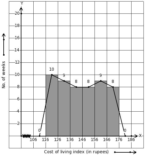 Given below is the cost of living index for a particular year in a city. Identify the class interval table for the given histogram and frequency polygon on the same graph.