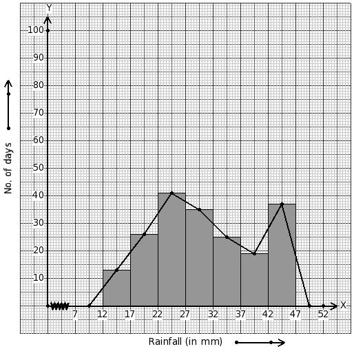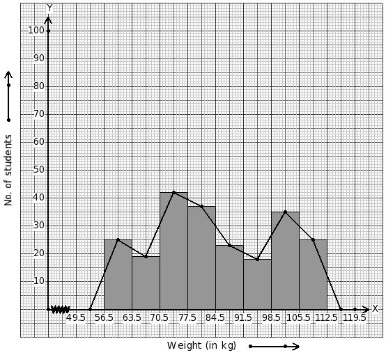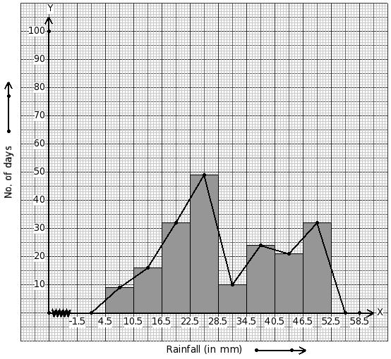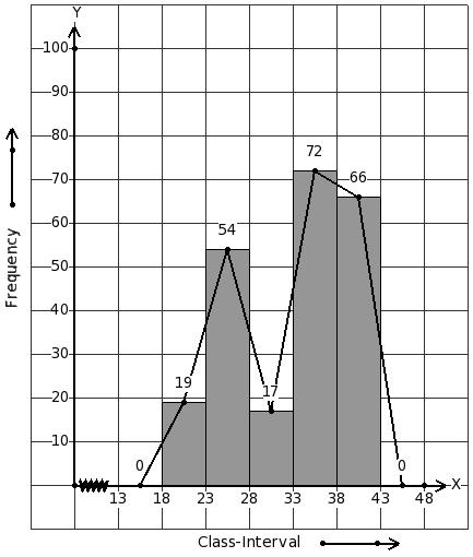 Identify the class interval table for the given histogram and frequency polygon on the same graph.