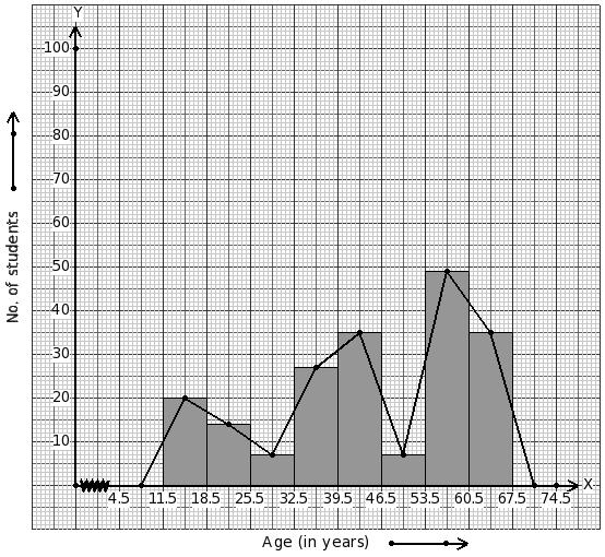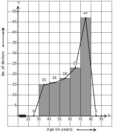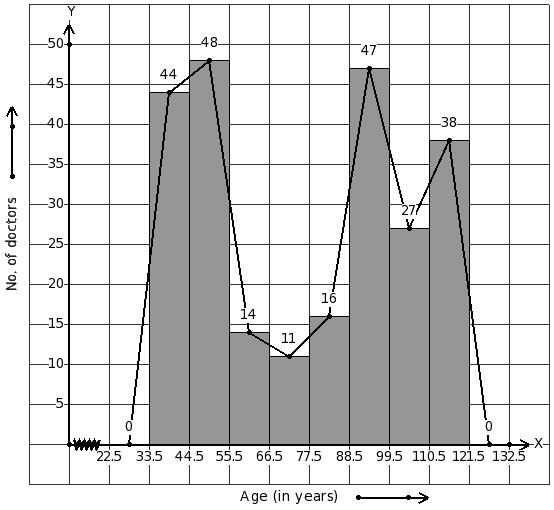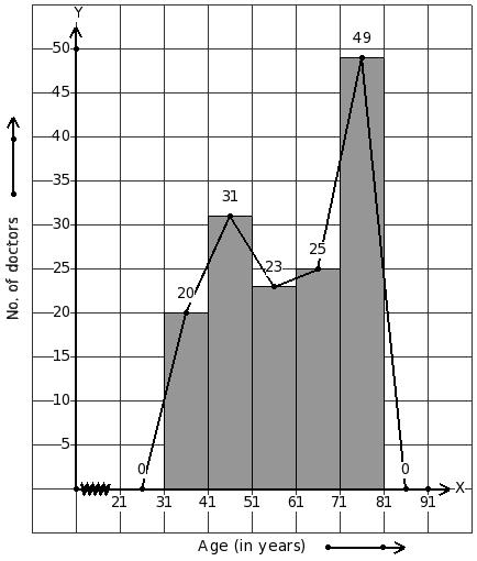 Given the number of doctors working in government hospitals in a city in various age groups. Identify the class interval table for the given histogram and frequency polygon on the same graph.