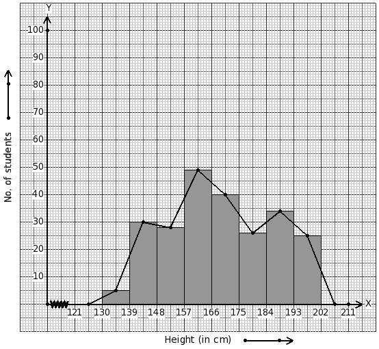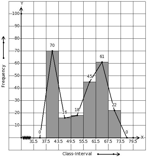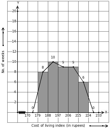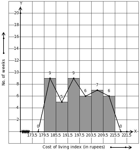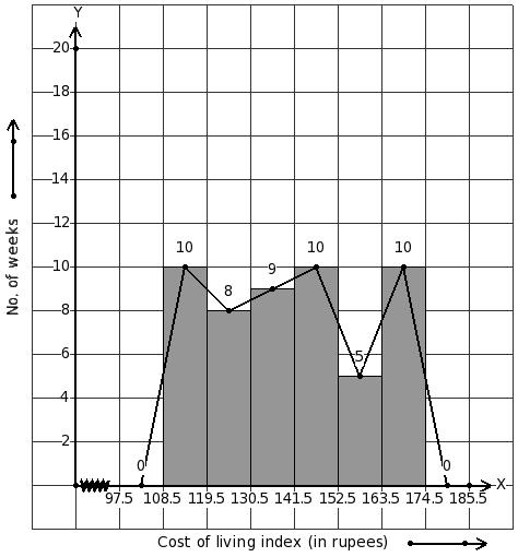 Given below is the cost of living index for a particular year in a city. Identify the class interval table for the given histogram and frequency polygon on the same graph.