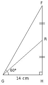 In the given figure, △FGH is a right angle triangle with ∠H = 90° and GH = 14 cm. R is the mid-point of FH. Find the length of the altitude from H to FG.