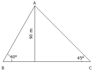 There are two temples one on each bank of a river, just opposite to each other. One of the temples is 90 m high. As observed from the top of this temple, the angles of depression of the top and foot of the other temple are 45° and 60° respectively. Find the height of the other temple. |