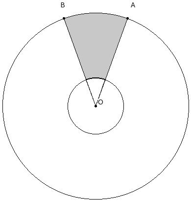 In the given figure, arcs of two concentric circles of radii 19.00 cm and 5.70 cm are drawn with center O. If ∠AOB = 40°, find the area of the shaded region