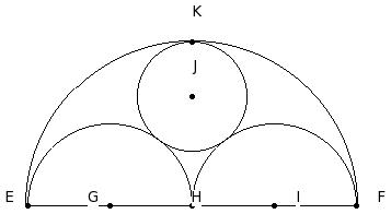 EF is a line segment and H is its mid-point. Three semi-circles are drawn with EH , HF and EF as diameters. G , I and H respectively are the centres of these semi-circles. A new circle is drawn touching these three semi-circles. Find its radius, given EG = 8 cm |
