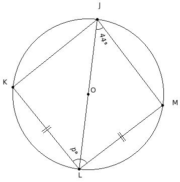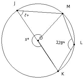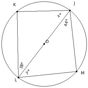 O is the centre of the circle. If ∠JLK = 38° and ∠LJM = 44°, find x°, y°