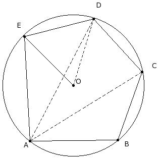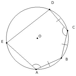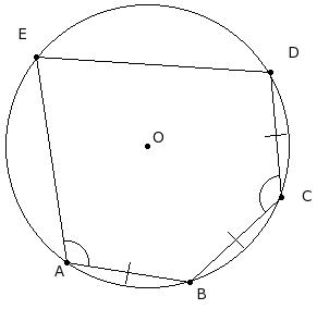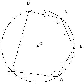 In the given figure, a pentagon is inscribed in a circle with centre O. Given AB = BC = CD , ∠BCD = 104° and ∠EAB = 107°. Find ∠ABC