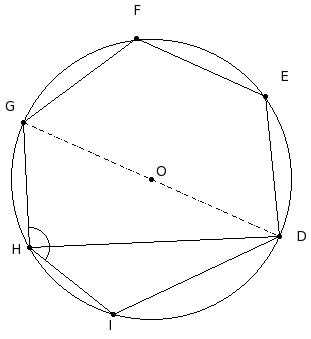 In the given figure, a hexagon is inscribed in a circle with centre O. Given DE = EF = FG and ∠GHI = 131.32°. Find ∠DHI