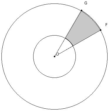 In the given figure, arcs of two concentric circles of radii 18.00 cm and 7.20 cm are drawn with center O. If ∠FOG = 30°, find the area of the shaded region