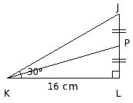 In the given figure, △JKL is a right angle triangle with ∠L = 90° and KL = 16 cm. P is the mid-point of JL. Find the length of the altitude from L to JK.