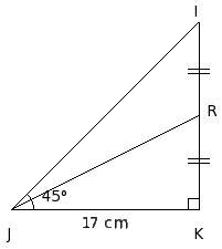 In the given figure, △IJK is a right angle triangle with ∠K = 90° and JK = 17 cm. R is the mid-point of IK. Find ∠RJK using tables.