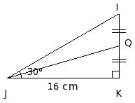 In the given figure, △IJK is a right angle triangle with ∠K = 90° and JK = 16 cm. Q is the mid-point of IK. Find ∠QJK using tables.