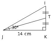 In the given figure, △IJK is a right angle triangle with ∠K = 90° and JK = 14 cm. T is the mid-point of IK. Find the length of the altitude from K to IJ.