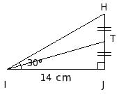 In the given figure, △HIJ is a right angle triangle with ∠J = 90° and IJ = 14 cm. T is the mid-point of HJ. Find ∠TIH using tables.